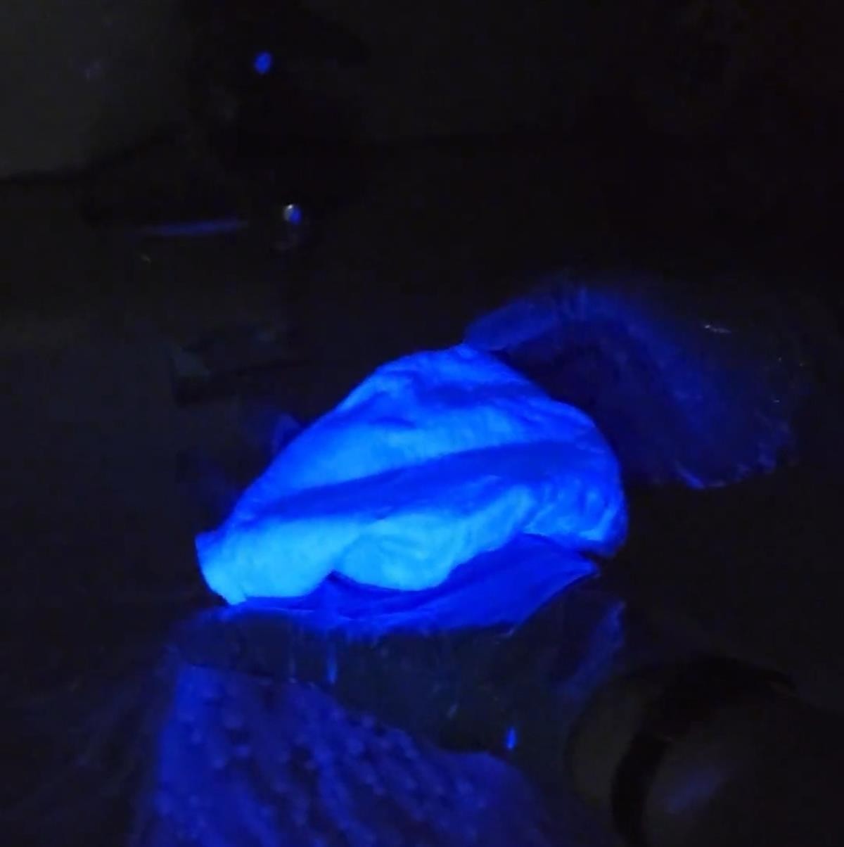 洗完衣服后会不会有残留?随后,主播用洗脸巾(不含荧光增白剂)模拟洗衣服,滴了上述4款洗衣液搓洗,检测发现洗脸巾均有不同程度荧光现象。视频中,浸湿的洗脸巾泛着蓝紫荧光,拧出来的水和双手也是同样的颜色,将水池灌满,里面全是蓝紫色的水,这一现象还被调侃像影视作品中的荧光海。用了上述4款洗衣液的洗脸巾清洗后晾晒,发现荧光增白剂仍有残留,难洗掉。